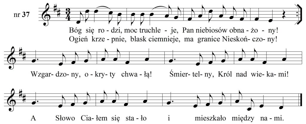 Dalsza część zwrotki operuje nowym materiałem motywicznym, który płynnie przechodzi w refren wieńczący każdą ze zwrotek: A Słowo Ciałem się stało i mieszkało między nami! Analiza tej części pieśni wykazuje szereg osobliwości.
