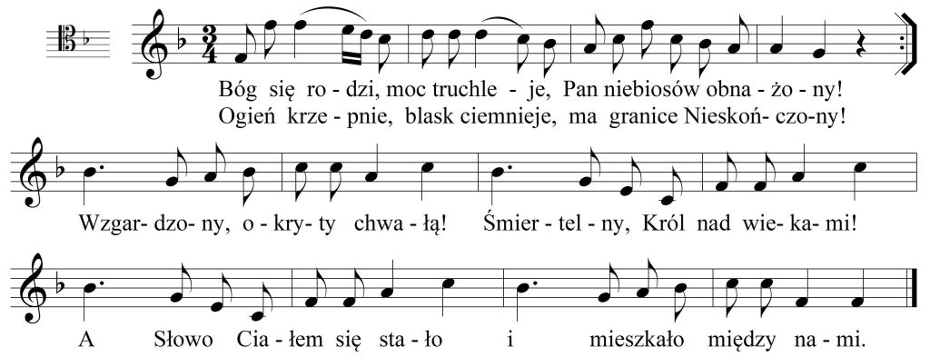 Kolędę otwiera radosny zwrot melodyczny, towarzyszący słowom Bóg się rodzi, moc truchleje. Radosny charakter podkreśla wznoszący skok o interwał oktawy. Następuje po nim powtórzenie dźwięku oraz melodia stopniowo opadająca (aż do III st. gamy). Pierwszy motyw wykorzystany w kolędzie obejmuje cały takt.
