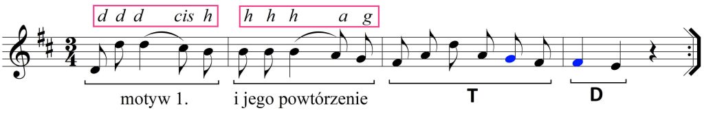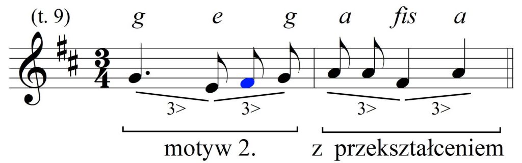 Motyw ten powraca w drugim takcie, choć jest on tam mniej dostrzegalny. Analiza wszak materiału dźwiękowego ukazuje operowanie tym samym schematem. Frazę kończy melodia prowadzona po dźwiękach T, aż do jej zawieszenia – w takcie ostatnim – na D (kolorem wskazano dźwięki obce)