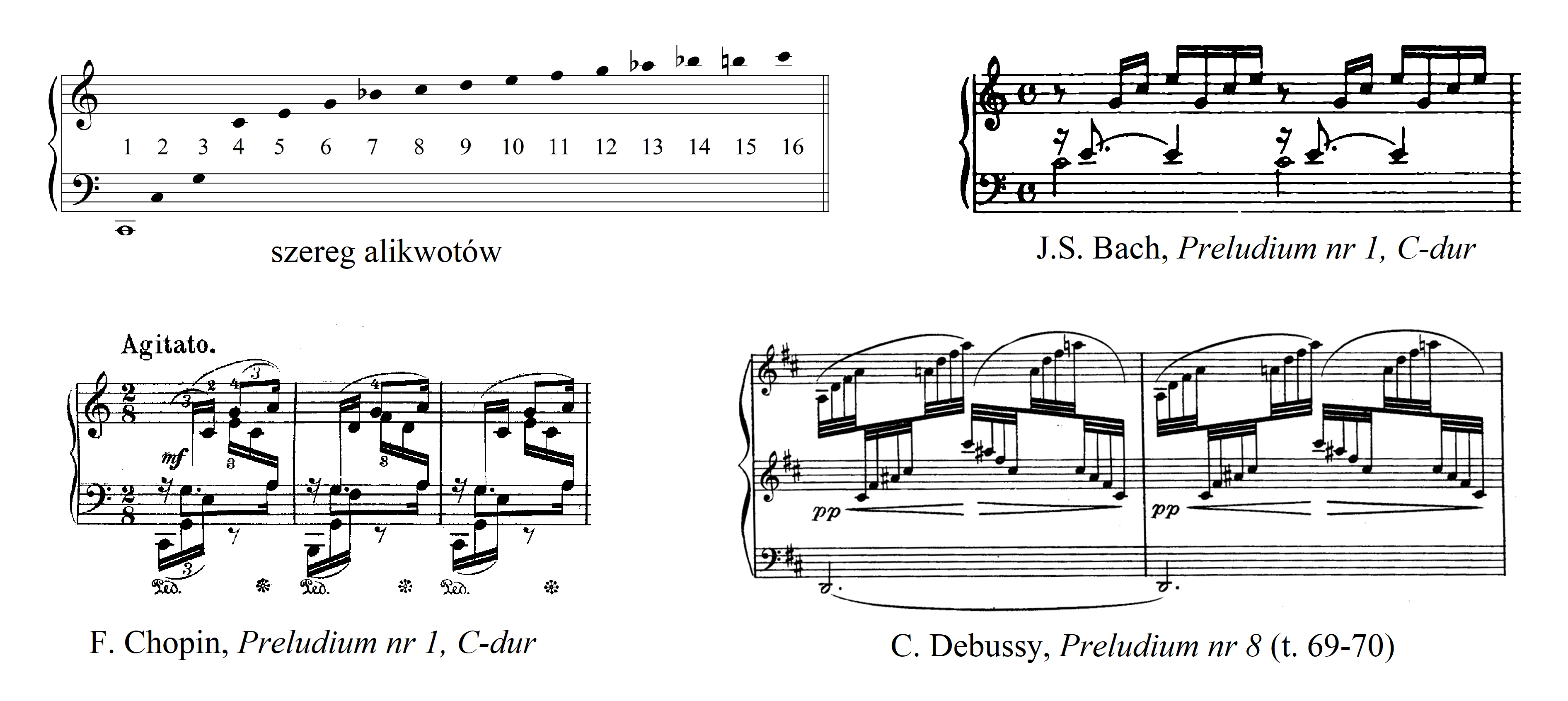 W trakcie badań Nazajkiński zwrócił uwagę na uderzające podobieństwo dźwięków Preludium nr 1, C-dur J.S. Bacha do rozkładu tonów harmonicznych; analogicznie w Preludium nr 1 F. Chopina, czy Preludium nr 8 C. Debussy’ego: