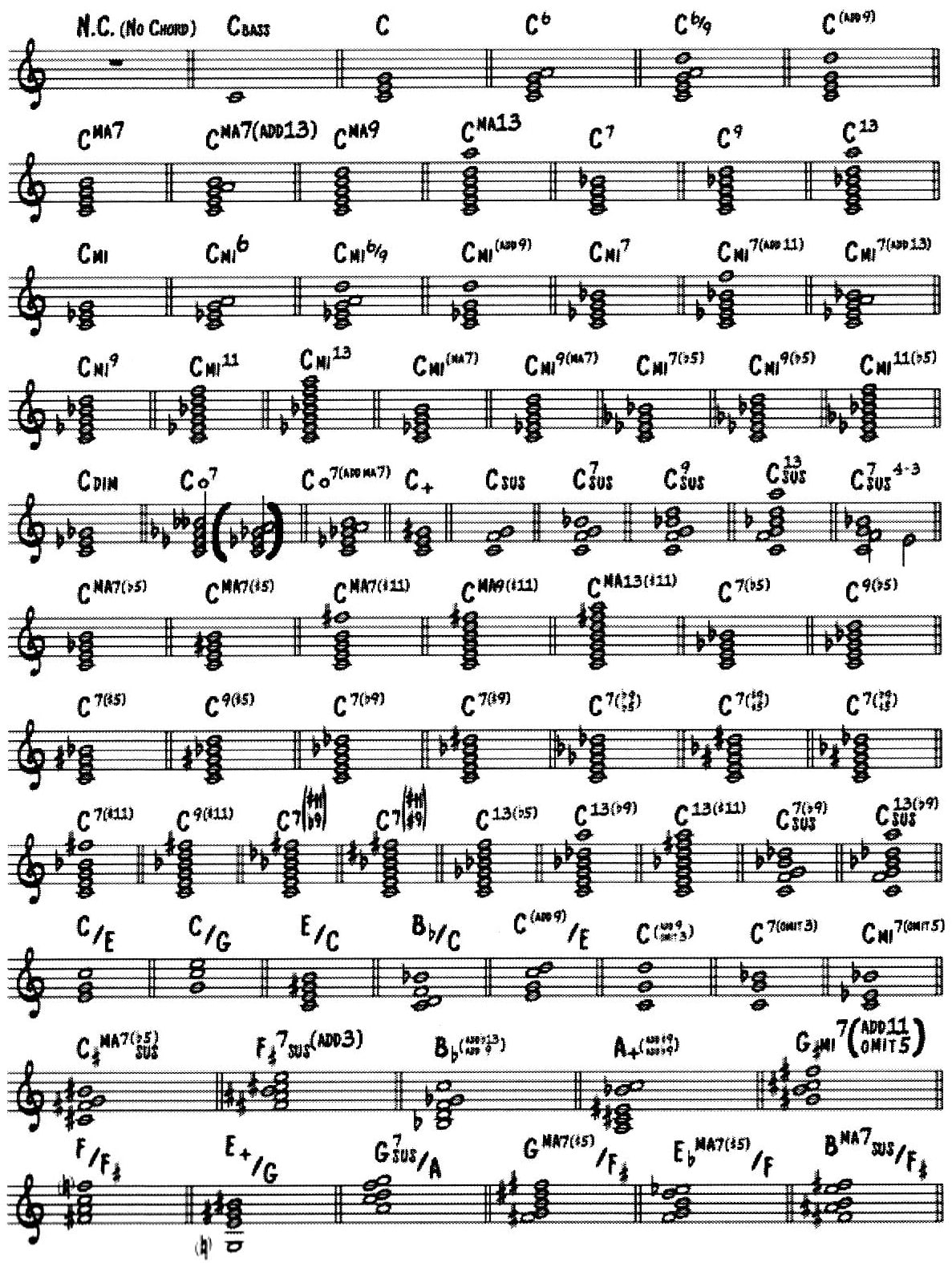 Teorię jazzu otwiera uwaga dotycząca wskazywania harmonii przy pomocy literowych symboli akordowych. Temu zagadnieniu autor poświęca nieco więcej miejsca, przedstawiając szczegółową specyfikację, „podział gatunkowy” akordów wraz z graficzną ilustracją (po kliknięciu w miniaturkę ukaże się obraz pełnowymiarowy):