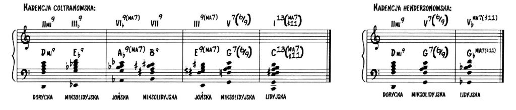 • kadencja coltrane’owska (od Johna Coltrane) – bazująca na relacjach wielkotercjowych,
