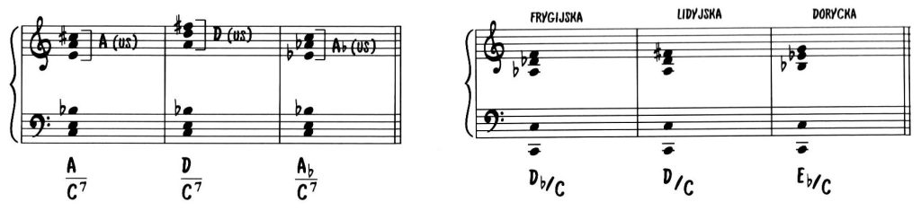 Pierwszy przypadek stanowi tzw. upper structures, czyli nałożenie dwóch różnych akordów: w planie górnym (prawa ręka) i dolnym (lewa ręka); oddziela je pozioma kreska.