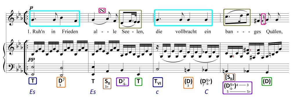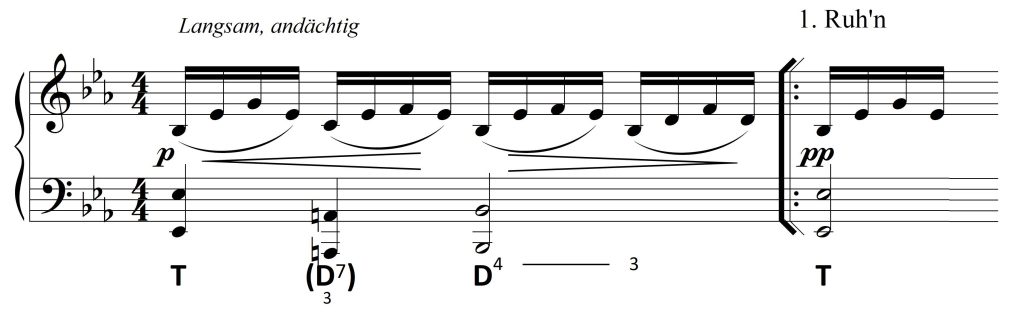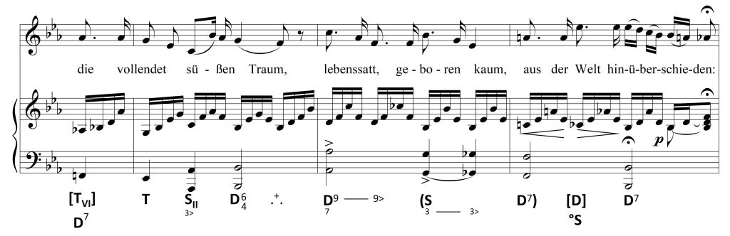 Argumentem przemawiającym za uznaniem całego odcinka jako frazy II (a nierozdzielaniu go po słowach ’süßen Traum’), jest plan harmoniczny. Wykorzystana do opracowania wspomnianych słów dominanta zmienia swą postać w takcie następnym, a jako akord nonowy, stanowi najsilniejszy z powszechnie stosowanych akordów dysonansowych. Jej ekspresja ma charakter dynamiczny, a więc nieodpowiedni dla przestoju. Ruchliwość narracji podkreśla opisana wyżej linia melodyczna, a wykorzystana w jej konstrukcji progresja (lebenssatt, geboren kaum) prowadzi do kulminacji w takcie następnym.
