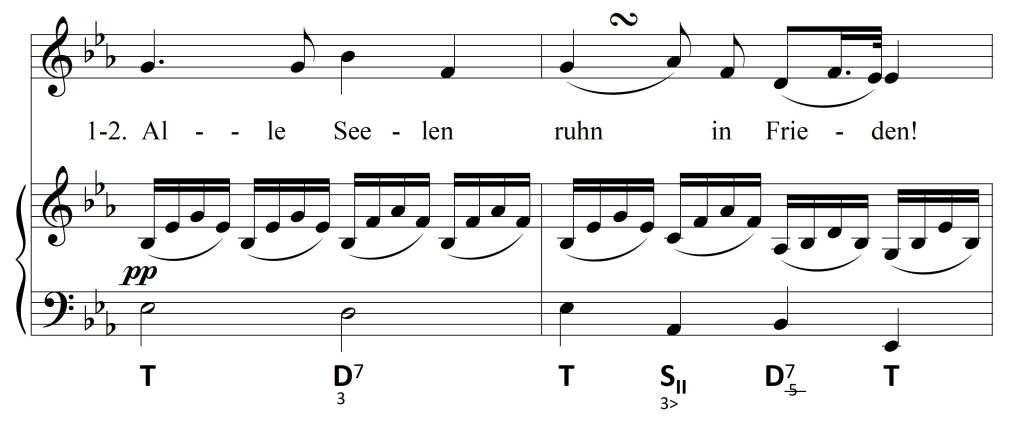 Schubert odzwierciedla przekaz ten za pomocą muzycznych środków: prośba o pokój otrzymała opracowanie prostsze, a wskazanie dusz, jako odbiorców – podkreślono urozmaiconą melodią, dodatkowo z wykorzystaniem obiegnika. Kontrapunktuje je omówiona już partia akompaniamentu, fakturalnie podobna do tej ze wstępu. Również i ten odcinek tworzy swego rodzaju kadencję opartą na prostych akordach.
