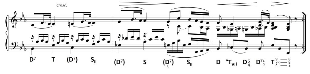 Interesujące analogie wyjaśnia plan harmoniczny. Oba odcinki rozpoczynają się akordem w funkcji tonicznej, choć za drugim razem jest nią akord zastępczy. Następuje po nich forma dominantowa w pierwszym przewrocie. Dalszy fragment wykorzystuje odmienne współbrzmienia, co jest wyrazem rozwoju pomysłów muzycznych. Ostanie dwa akordy reprezentują relację dominantowotoniczną. I chociaż nominalnie omawianą frazę kończy akord wtrącony, (D), jest on akordem majorowym – konsonansem – a dzięki wcześniejszemu wtrąceniu brzmiącym jak tonika (na skutek tonikalizacji).