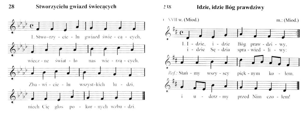 Również wśród tradycyjnych polskich pieśni kościelnych znajdziemy kilkanaście kompozycji o podobnej budowie. Pozbawione są jednak fermat — zdają się nie mieć odpowiedniego miejsca na dokończenie frazy i wzięcie oddechu, np.: