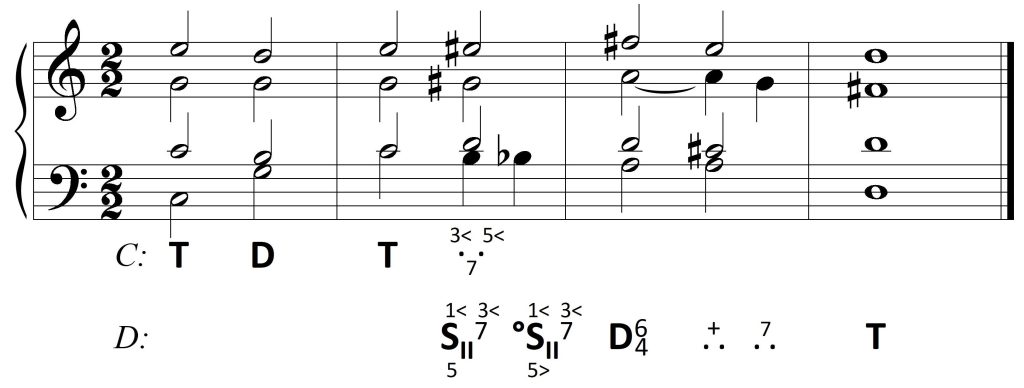 Modulację ilustruje przykład przejścia z tonacji C-dur do D-dur, która dokonuje się przez podwyższenie tercji i kwinty akordu tonicznego. Otrzymujemy w ten sposób brzmienie alterowanego akordu II stopnia w tonacji majorowej, leżącej sekundę wielką wyżej. Akord ten jest jednocześnie pierwszym ogniwem kadencji wielkiej doskonałej rozszerzonej. Zamieszczona na początku kadencja doskonała (TDT) ma za zadanie utrwalić tonację początkową: