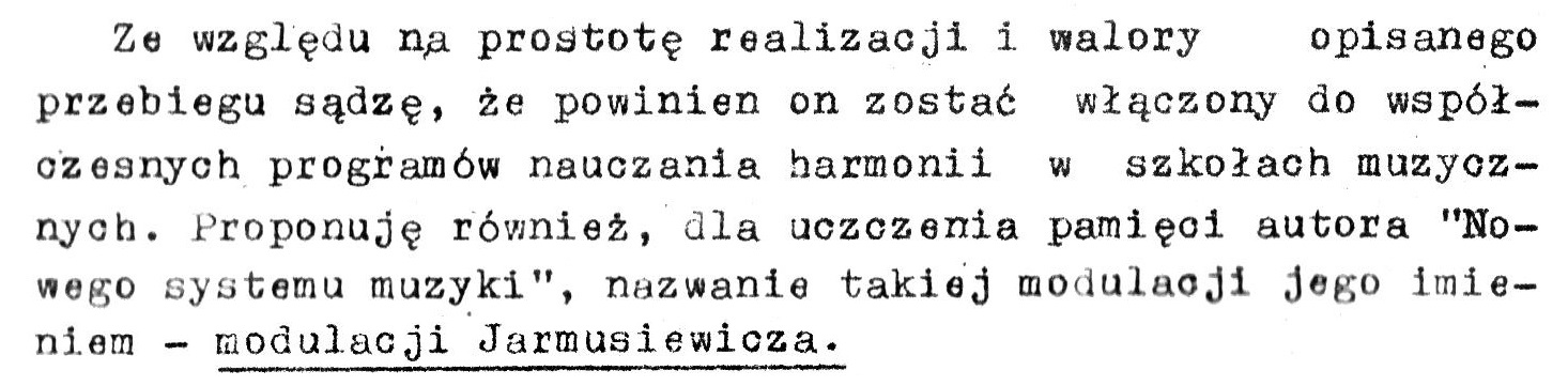 Interesującą postać ks. Jarmusiewicza oraz jego nie mniej ciekawą myśl teoretyczną przybliżył Czesław Karol Zawiejski. Wspomniany sposób modulowania został przez niego wyszczególniony już we słowie wstępnym. Przedstawiwszy ją krok-po-kroku oraz poparłszy słowo grafiką nutową, zawarł następującą konkluzję: