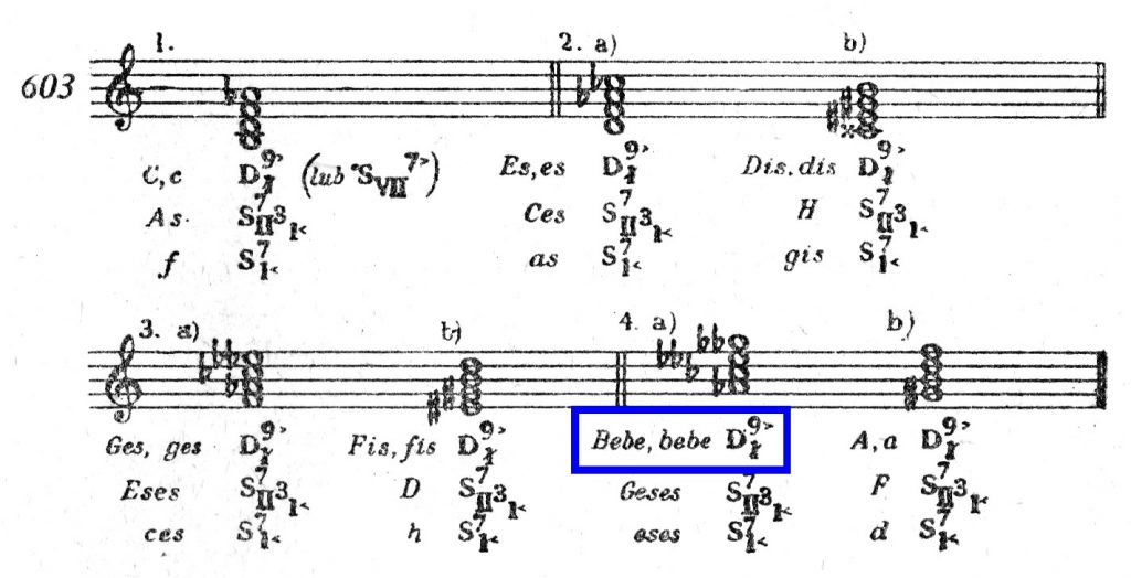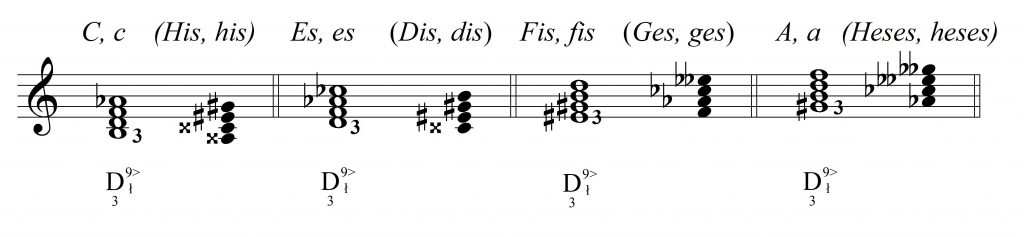 Zamieniając enharmonicznie małą septymę na sekstę zwiększoną, otrzymuje się nową postać akordu. Jest to °S71< w tonacji oddalonej o 2> niżej. Ważne przy tym jest, aby odpowiednio ustawić modulującą D7 – oprzeć na prymie lub septymie: