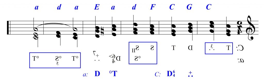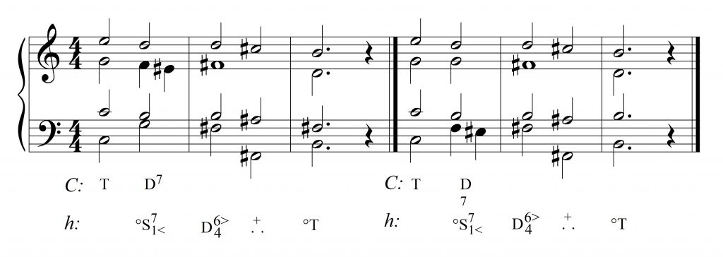 Weźmy dla przykładu pierwszy akord: jego podstawę, h, możemy zinterpretować jako tercję D – oznaczać to będzie, że jesteśmy w tonacji C-dur lub c-moll. Ponieważ w przewrotach brzmienie pozostaje takie samo, każdy następny składnik również możemy uznać za tercję D, czym zmienimy tonacje: