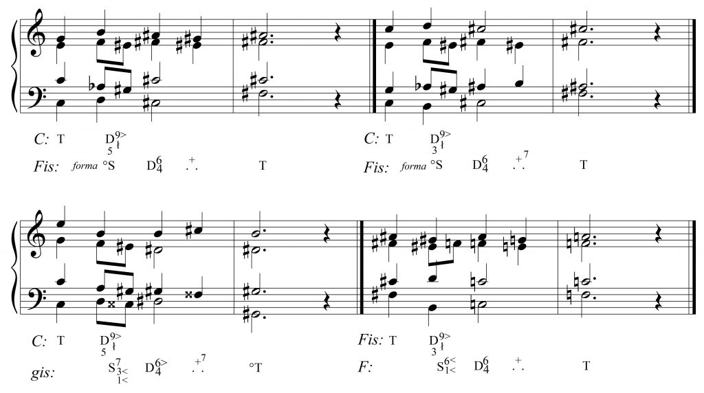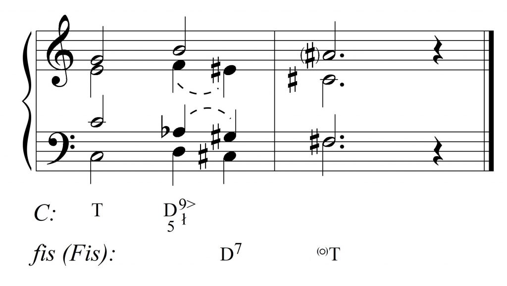 Pobieżna analiza zdaje się zaprzeczać: akordy dzieli relacja trytonu (fis znajduje się dokładnie w połowie drogi między oktawą c–c), nie mają dźwięków wspólnych i nie występują w jednej tonacji.