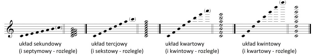 Przykład po lewej stronie ukazuje teoretyczne możliwości ułożenia akordów zestawianych sekundami; przykład po prawej – jego konkretyzację: są to akordy złożone z sekund gamowłaściwych.