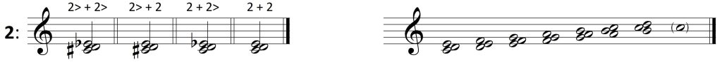 Zaczniemy od interwału sekundy. Prymę i oktawę należy z gruntu odrzucić – gdyż akord jest strukturą złożoną z dźwięków różnych co do nazwy. Akord o morfologii sekundowej wygląda tak: