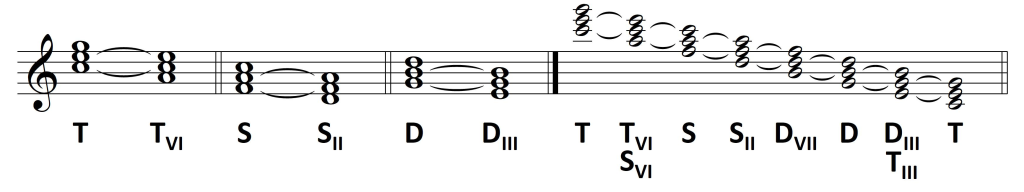 Każda tonacja dysponuje zastępem akordów głównych i pobocznych. Jedne są ważniejsze od pozostałych (triada harmoniczna), inne – są zaledwie ich „odblaskiem” (substytutem), a jeszcze inne związane są z określoną odmianą majoru lub minoru. Wszystkie zaś pełnią różne FUNKCJE. Za pomocą właśnie funkcji definiujemy ich harmoniczne znaczenie: T, °S, D, czy °SII↓.