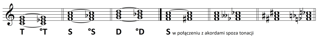 Przykład drugi ilustruje płynne następstwo (łączenie) wszystkich akordów głównych i pobocznych w danej tonacji.