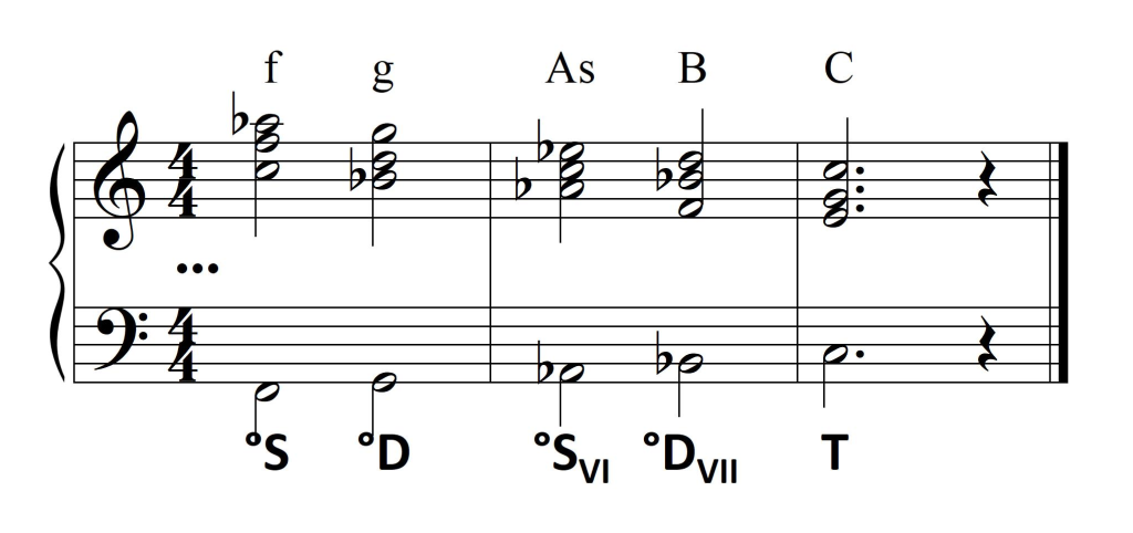 A stąd już bliska droga do praktycznego użycia akordów podobnie łączonych, przyjemnie brzmiących, jak choćby niniejsza kadencja archaizująca: