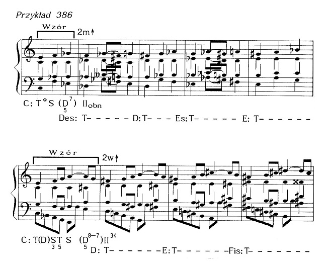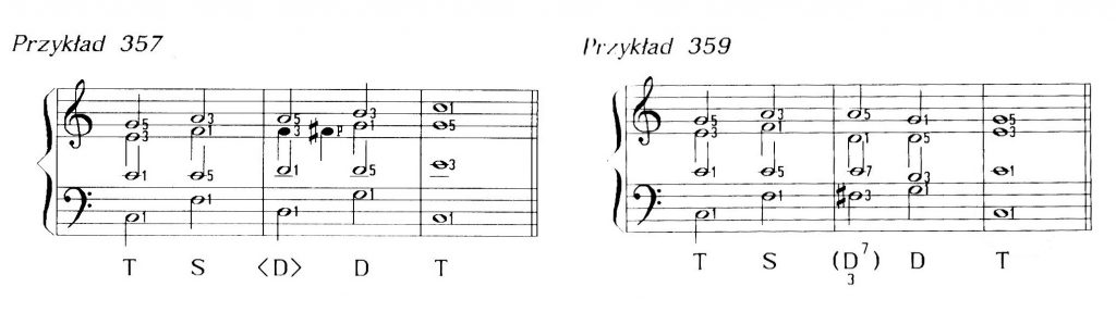 Niezmiernie intrygujące okazały dla mnie się wyjaśnienia związane z dominantami pozornymi oraz ich odróżnienie od dominant wtrąconych. Okazuje się bowiem, że zdaniem krakowianina, „zwykłą” SII – dla podkreślenia jej funkcji dominanty pozornej należy umieścić w ostrym nawiasie, tj. <D> (nie mylić z nawiasem okrągłym czy kwadratowym). Nawet alteracja tercji tego akordu, na przykład jako nuty przejściowej, ciągle jest rozumiana jako dominanta pozorna. Dominantą wtrąconą staje się wówczas, kiedy do durowego trójdźwięku dodamy septymę małą. Powstały w ten sposób akord możemy zapisać jako (D).