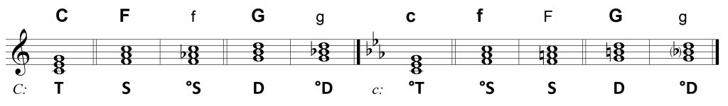 Podstawę współbrzmień w każdej tonacji stanowią funkcje główne, czyli triada harmoniczna. Mieszą się w niej wszystkie dźwięki danej gamy, dzięki czemu można nią zharmonizować, choć w prosty sposób, dowolną melodię.