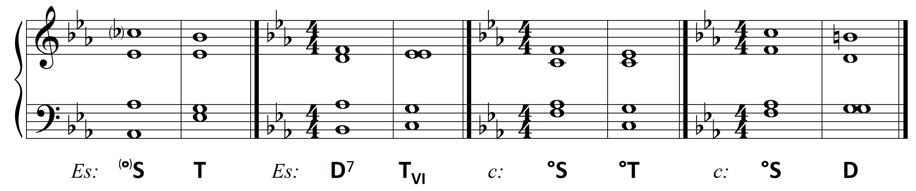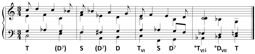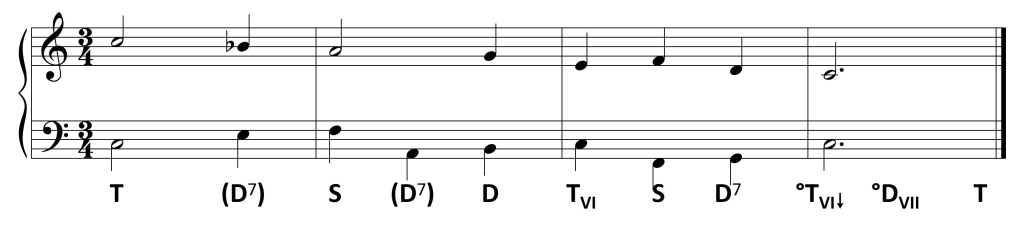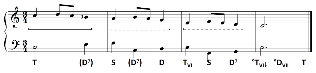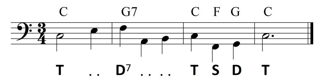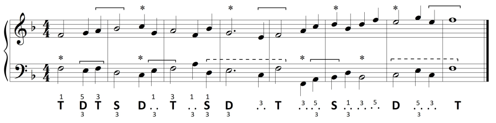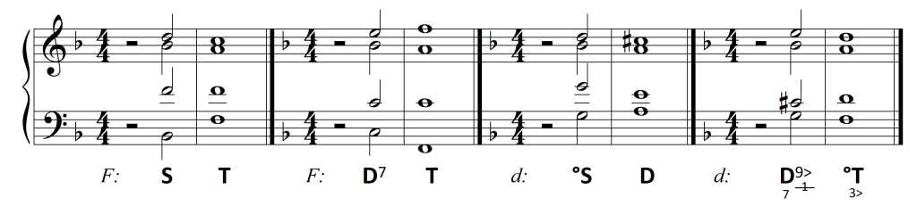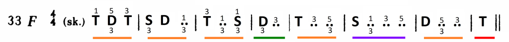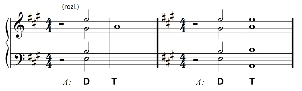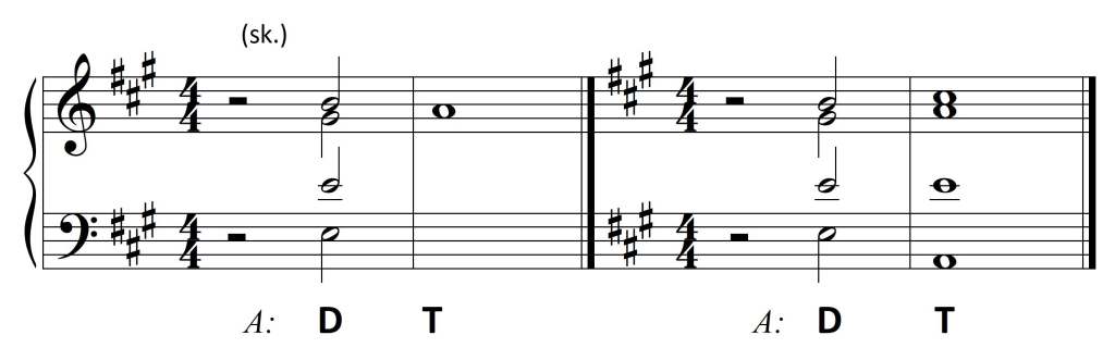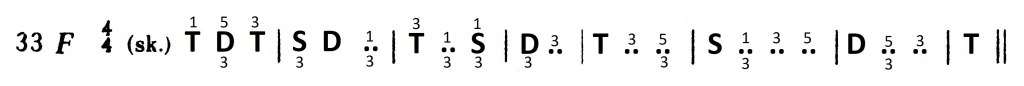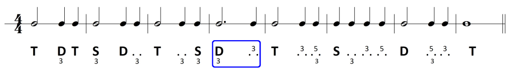 Wykorzystanie zaś dysonującej formy dominantowej ogranicza się do D7. Wprawdzie wszystkie dźwięki z taktu drugiego mieszczą się w D9, jednak nona – jako dysonans – zawsze opada. Pojawiający się w basie na drugą miarę dźwięk a jest więc dźwiękiem zamiennym dla tercji akordu: