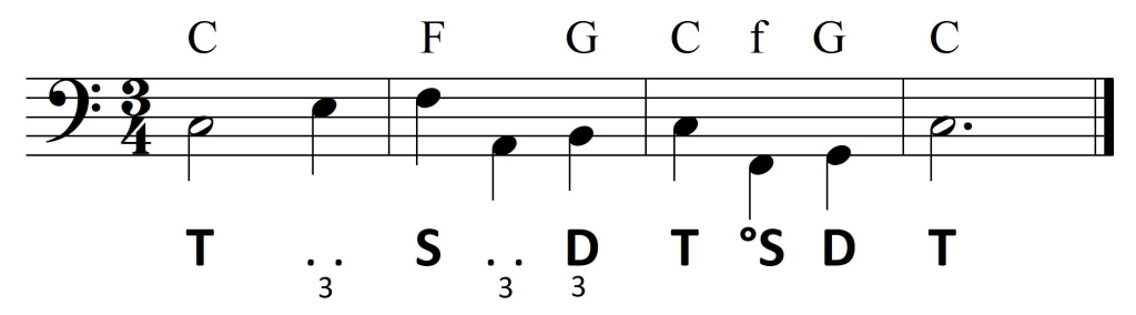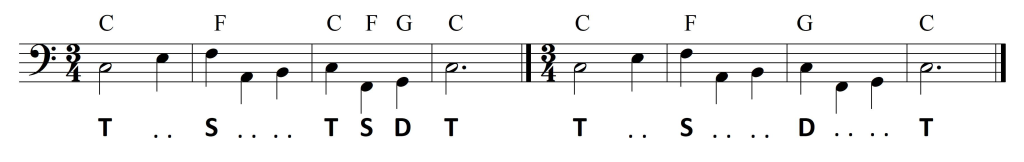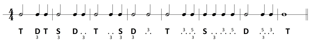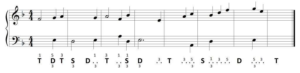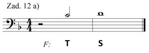 Rozpocznijmy od szybkiego przypomnienia materiału dźwiękowego triady harmonicznej — T: f-a-c, S: b-d-f, D: c-e-g.
