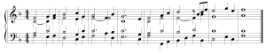 Na koniec trzeba sprawdzić poprawność konstrukcji oraz „wygładzić” miejsca wymagające retuszów. Idąc tym tropem, zmodyfikowałem trzeci takt od końca. Jest dobrym miejscem dla stworzenia punktu kulminacyjnego. Pomysł dotyczy innego urytmizowania melodii sopranowej – z wykorzystaniem drobniejszych wartości; zmiany te wymusiły nieznaczną korektę basu. Nowsza wersja przedstawia się następująco: