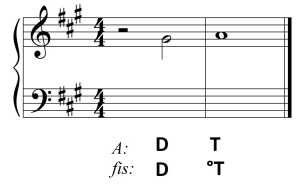 Zanotowana jako ćwierćnuta, D w pozycji tercji, stanowi odbitkę następnika. Rytm zyskuje na sprężystości, która jeszcze silniej podkreśla aspekt melodyczny – rozwiązanie dźwięku prowadzącego w połączeniu D-T.