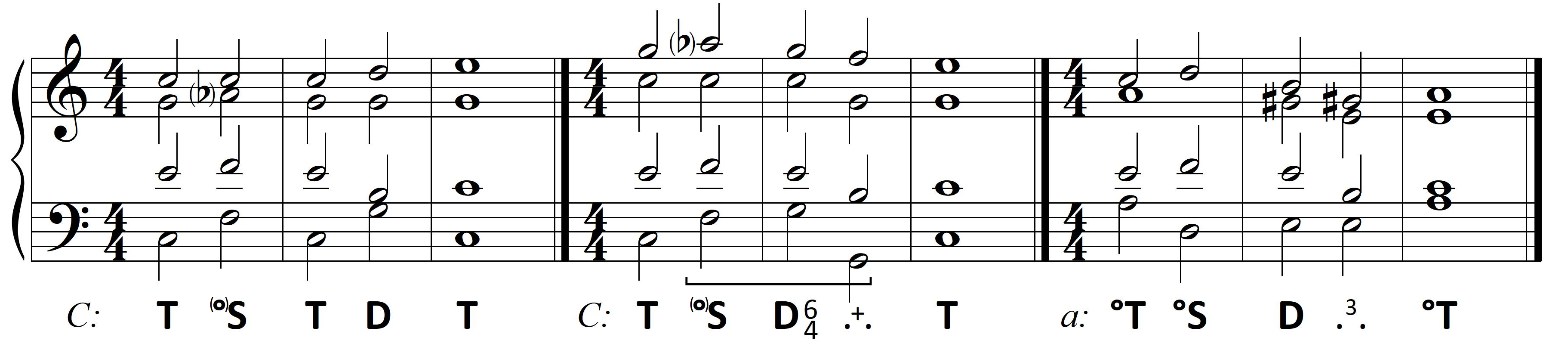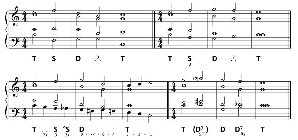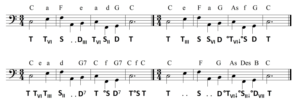Pierwsze dwa opracowania wykorzystują identyczne następstwo harmoniczne (przykład drugi ze zmianą układu – przeniesieniem melodii altowej do sopranu, oktawę wyżej). Jedyna zmiana harmoniczna, z T na D64  zapewnia płynniejsze prowadzenie basu. Ostatnia zaś ilustruje harmonizację w trybie minorowym.