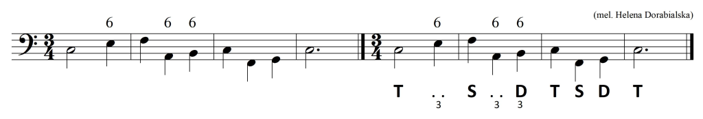 Jako materiał do pracy wybrałem zaprezentowaną wcześniej melodię Heleny Dorabialskiej, z której usunąłem oznaczenia b.c. – przekonajmy się, na ile sposobów można opracować tak skromny, bo czterotaktowy, oryginał. Dla lepszej orientacji pod melodią zanotowałem funkcje, a nad nią – literowe nazwy akordów.