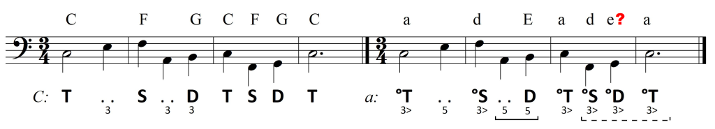 Wykorzystując zaledwie trójdźwięki triady harmonicznej, otrzymamy znaną już wersję. Zaś próba opracowania w trybie minorowym nie da satysfakcjonujących rezultatów. Otrzymamy zabronione w myśl klasycznych reguł łączenie dwóch trójdźwięków w II przewrocie, a także finalną kadencję opartą na akordach w przewrotach oraz pozbawioną dźwięku prowadzącego. I chociaż teoretycznie da się popełnić takie opracowanie, nie ma ono nic wspólnego ze sztuką muzyczną: