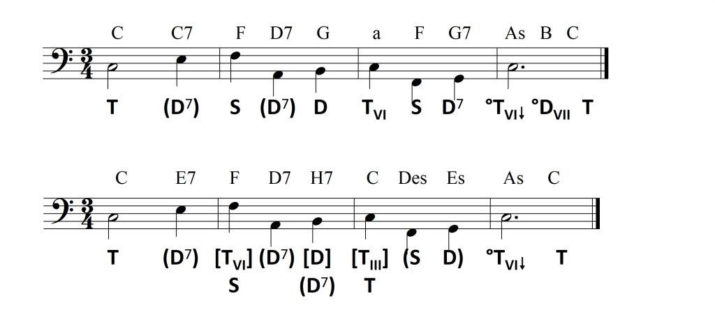 Mogą uprościć szkielet harmoniczny, choć w tym wypadku nie bez mankamentów. Wersja pierwsza, jakkolwiek  bardziej logiczna, zawiera nierównomierny puls harmoniczny (rozłożenie zmian funkcji). Pod tym względem  lepsza jest wersja druga, choć użycie dźwięków obcych w basie, zwłaszcza w przedostatnim takcie, narusza stabilność fundamentu konstrukcji: